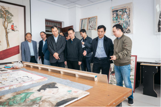 王亚杰书记、吕建荣副书记、田明纲部长及职能处室领导参观环境艺术工作室、丝网印工作室,并通过丝网印刷的方法参与作品制作。